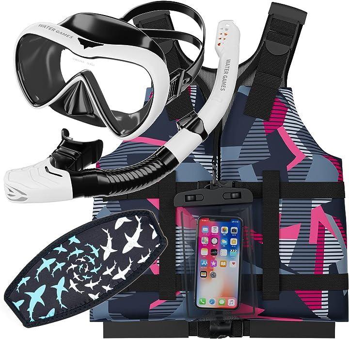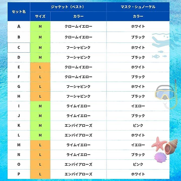 ・「スリムで動きやすいマリンベスト+シュノーケルセット」動きやすいスリムでスマートなフローティングベストとマスク、シュノーケルの嬉しい組み合わせセットです。