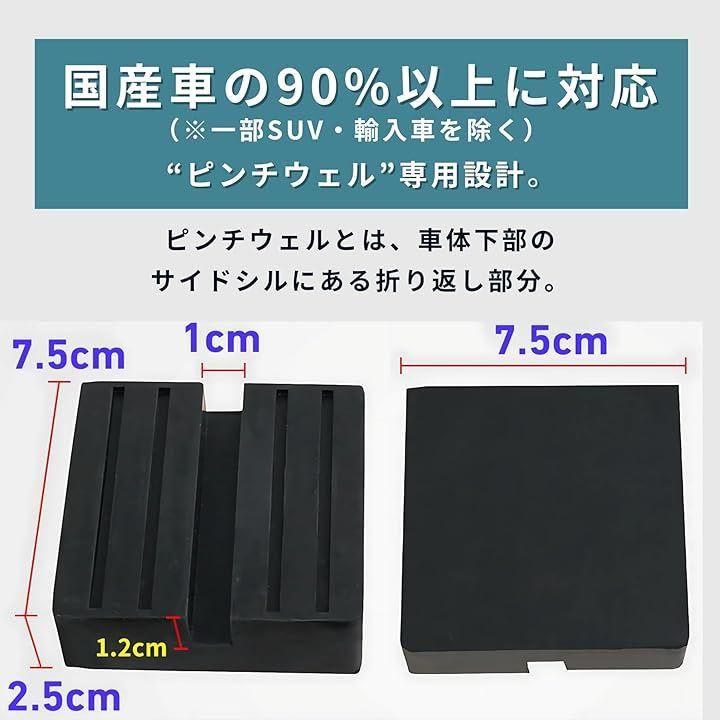 しっかり支えるプロ仕様」 高密度ゴム製の構造により、耐荷重性はもちろん、金属製ジャッキとの摩擦で滑ることを防ぐ防滑性能も強化。