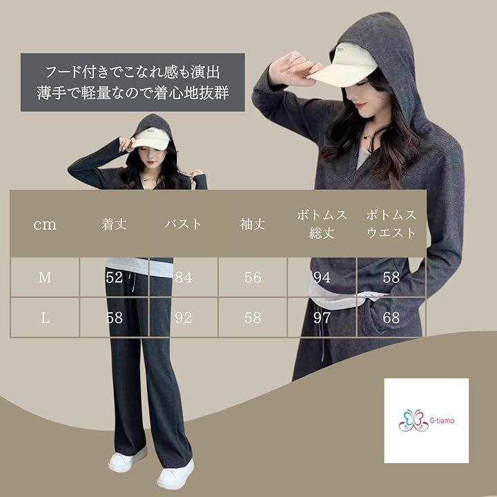 「サイズ」M(トップス 着丈52cm 胸囲84cm 袖丈56cm ボトムス 総丈94cm ウエスト58cm)・L(トップス 着丈58cm 胸囲92cm 袖丈58cm ボトムス 総丈97cm ウエスト68cm)*平置き採寸