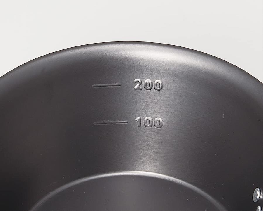サイズ:幅20.5×奥行11.8×高さ4.5cm素材・材質:本体=アルミニウム合金 板厚0.8mm(アルマイト加工) 止具・ハンドル=ステンレス満水容量:300ml目盛付