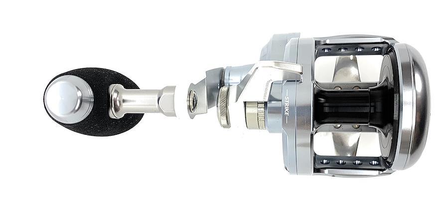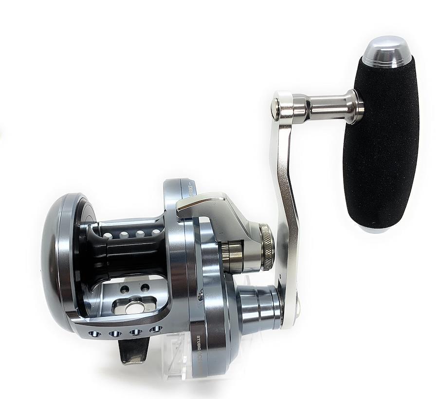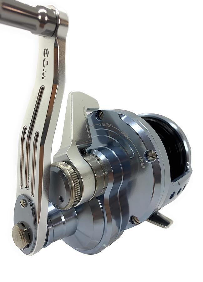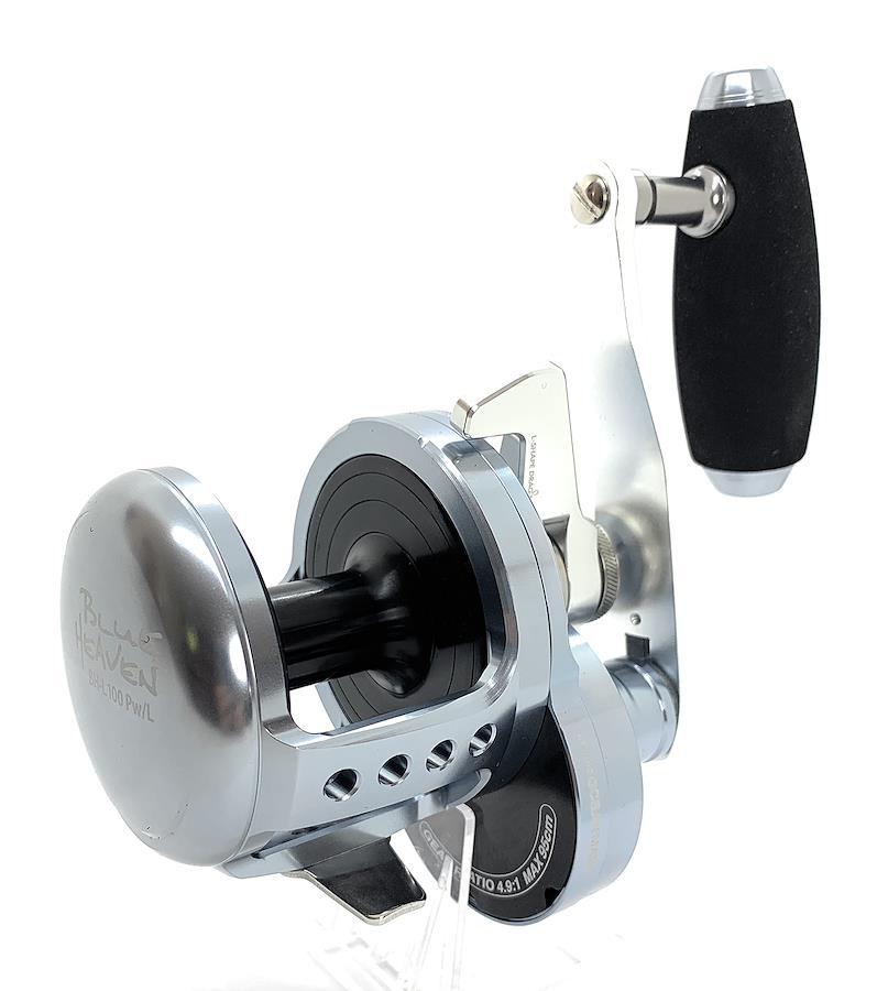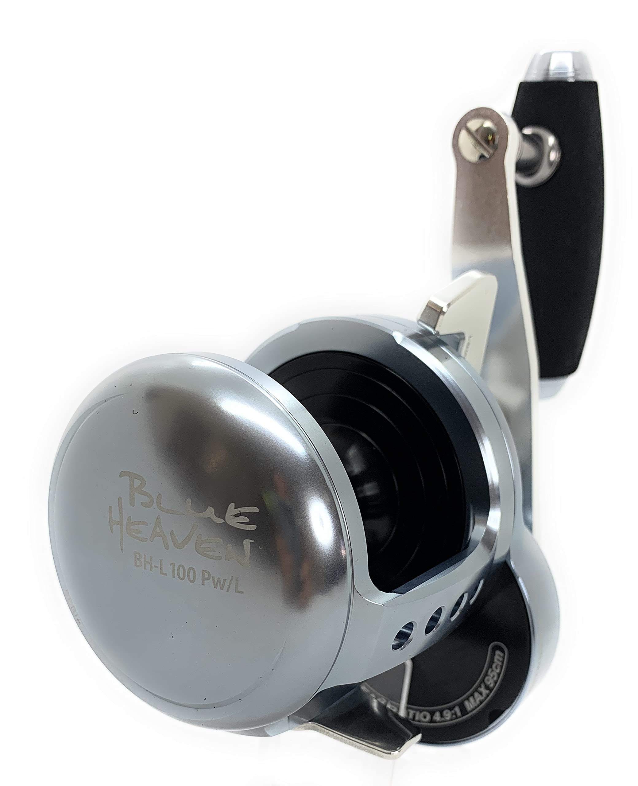 モデル:BHL100PW/L、ギア比:4.9:1 (95cm)、ドラグ最大ドラグパワー:14kg、ラインキャパシティ:PE 8-400M/6-500/4-750/3-1000 *YGK WX8シリーズライン、重量:655g、カラー:ライトブルードラッグレバーはハンドルを回転させることで連結し、自動的にストライク位置に戻ります。 ジガーやソルティガなどのクラッチタイプのリールが有利だったボトムの根魚狙いや、攻撃的なフォールバイトを狙うタチウオ狙いにもお使いいただけます。 むしろレバードラグだからジグのフォールスピードをFREEとMINの間に調整し、バイトまで持って行く。スプールフリー時は、2つの小径ベアリングがスプールを支持し、リールリング時には大径ボールベアリングがスライドしてスプールをしっかりと支えます。 レバードラグの特性を生かしたスプールフリーシステムを採用し、スピニングリールに匹敵する驚きのフォールスピードを実現しました。小径ラインに対応する強度を維持しながら限界まで薄くした軽量スプール。 ラインキャパシティを最大限サイズまで引き出す深型設計のPE1.5~1000mを確保しました。ドラグ機構とギアを収容した右プレートの直径と、パーミングを重視した左プレートの直径が変更され、STUDIO Ocean Markオリジナルの左右非対称フレームがマシンカットリールとして採用されました。