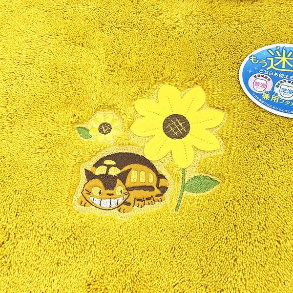 となりのトトロの兼用蓋カバー。タイプにかかわらず使っていただける吸着シート付きです(一部、お使いになれない便器がございます)。ヒマワリの明るいイエローカラーの中に立体的なネコバスの可愛いアップリケがアクセントに♪