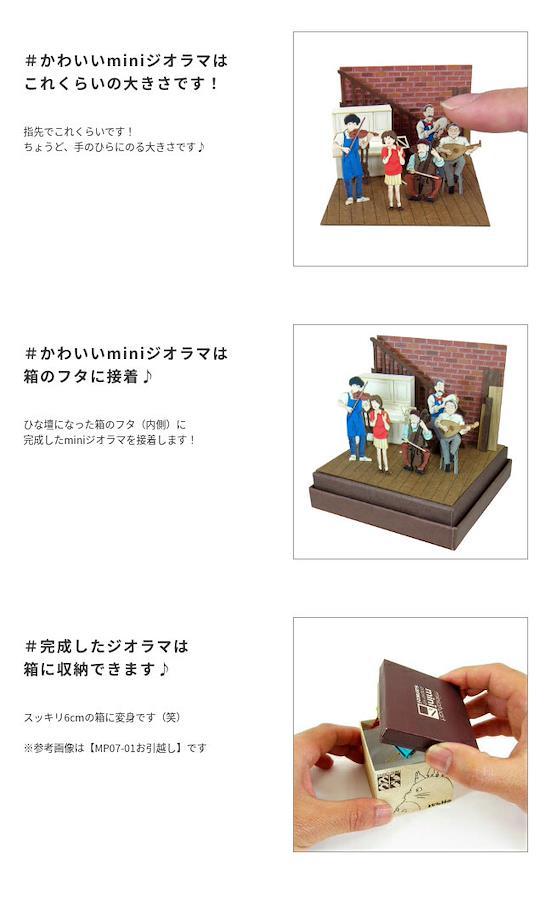 スタジオジブリminiは1辺6cmの箱の上に小さなジオラマが作れるペーパーキットです♪完成すると「耳をすませば」の世界がコマ送りのようにお楽しみいただけます☆ ※こちらの商品は組立てペーパーキットです。完成品ではございませんのでご注意ください。■商品名 スタジオジブリmini 耳をすませば 合奏しようよ■コピーライト © 1995 Aoi Hiiragi / Shueisha - Studio Ghibli - NH■セット内容 レーザーシートA~W(23枚)、ベース(1枚)、組み立て説明書■スケール Non-scale■サイズ W60×D60×H60(107)mm ※内はジオラマを乗せた時の寸法です■対象年齢 12才以上■組立て所要時間 2時間~■組立てレベル ★★☆☆☆■みにちゅあーとキットとは? ミニチュア制作の経験のない方でも、扱いやすい“紙” 素材で出来たECOペーパーキットです。製作道具はカッターナイフ、ピンセット、接着剤、定規、カラーペンなどがあれば作れますよ~♪