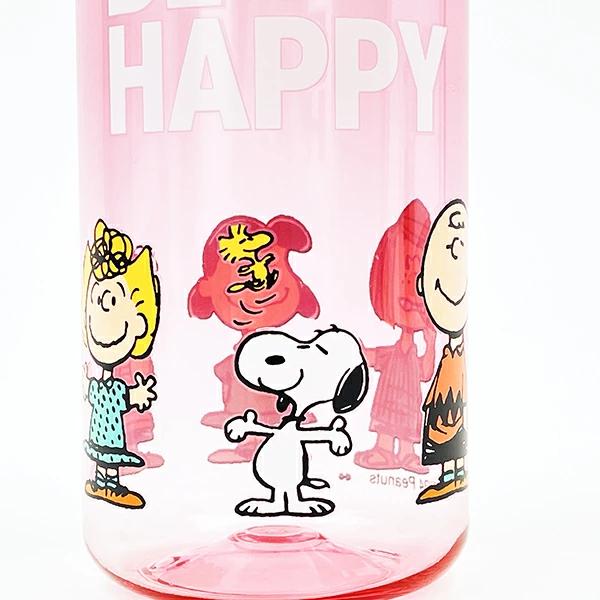 スヌーピーのクリアドリンクホルダーです。フタに持ち手が付いていて、持ち手の一部がバネになっていてバッグなどに引っ掛けられて持ち運びに便利♪ボトルもクリアなので中身も確認しやすい◎ランチのお供にもぴったりです☆【容量:540ml】