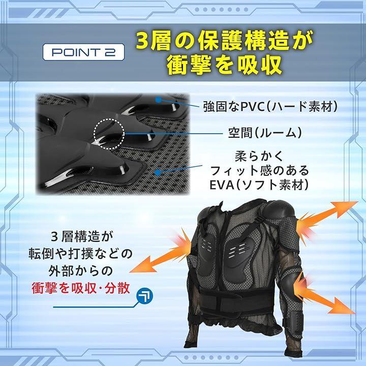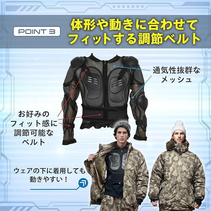 しっかりとした保護効果で、背中(脊椎)、腰、胸、肩、肘、腕といった重要な部位をカバー。