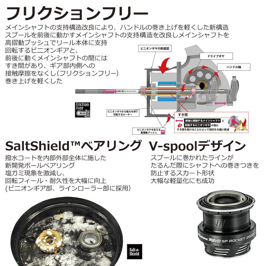 ギア比7超えのロケットギアを搭載したスピニングリール。ハンドル1回転あたり最大124cm(4000S)という驚異のリーリングスピードを実現。従来モデルのドライブギアに比べて、直径を最大117%(2500-4000番)大型化。耐久性向上に加えてトルクフルな巻き上げを実現。左右側面の容姿がまったく異なる新開発のボディーデザイン。ハンドル軸左側に接続されたメインギアをシンプルに覆うことで不要なスペースを徹底的に排除し、素材の厚さ、強度を落とすことなく軽量・コンパクトなボディを実現。ラインを保持する形状を2段形状にすることにより、30lbクラスの太いリーダーを確実に保持するラインクリップ搭載。ダウンショットリグのシンカーや、フックを保持するオプションパーツ、シンカーキーパーを付属。