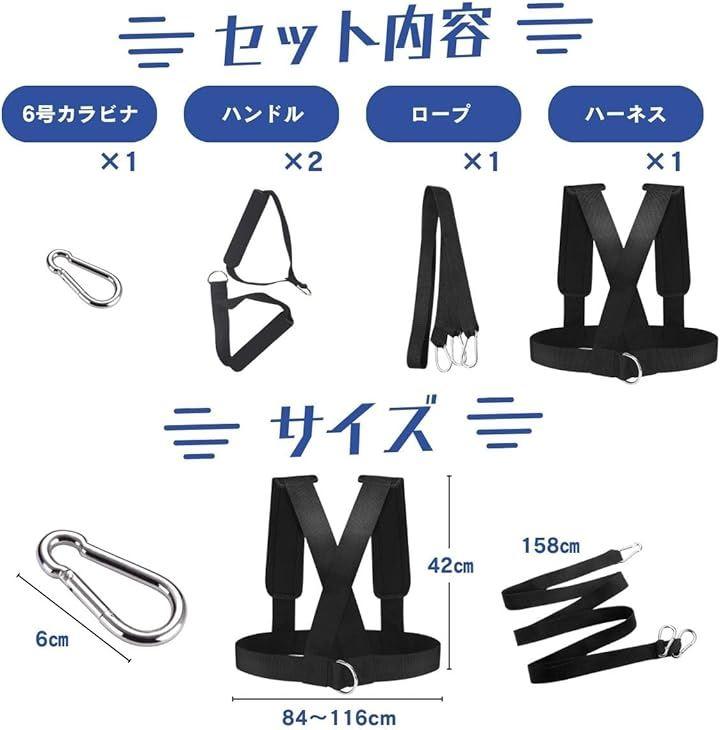 「セット内容」ハーネスx1、ロープx1、ハンドルx1、6号カラビナx1「サイズ」ハーネス:ウエスト調整84cm-116cm、ロープ:約158cm、カラビナ:約6cm