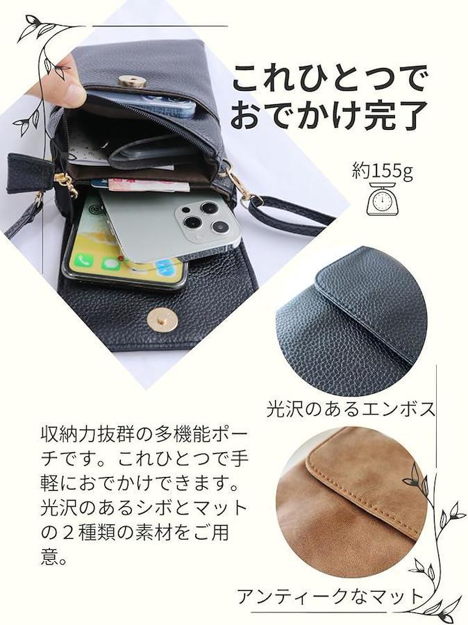 「おしゃれなスマホポーチ」シンプルでありながらスタイリッシュなデザインが魅力のショルダーバッグです。