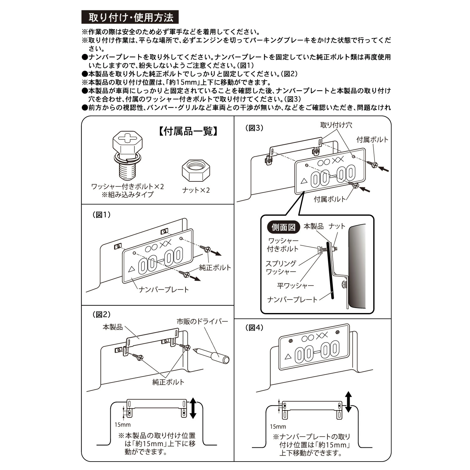 ●ナンバープレートを上方向に最大約50mm移動させて取り付けることができます。(高さ調整:約20~50mm)