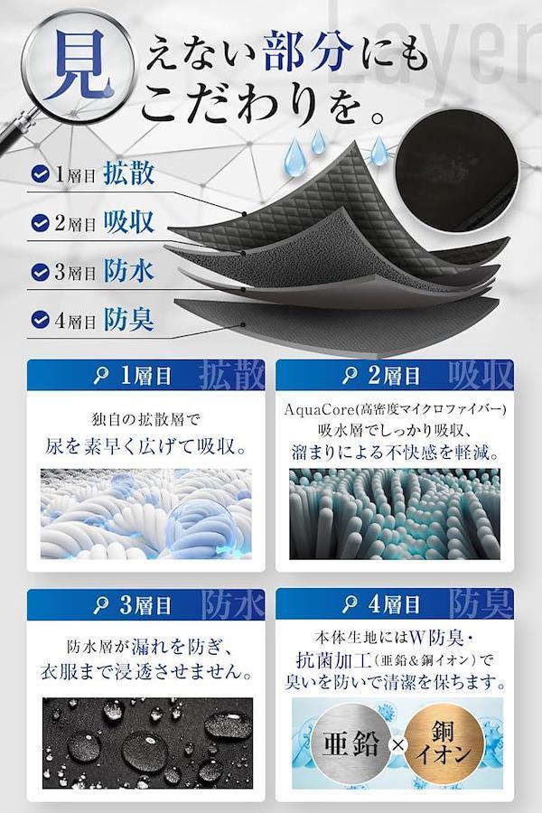 本製品は、生地に亜鉛イオン&銅イオンを含む抗菌・防臭加工を施しており、尿のニオイの原因菌の繁殖を抑えることが期待されます。