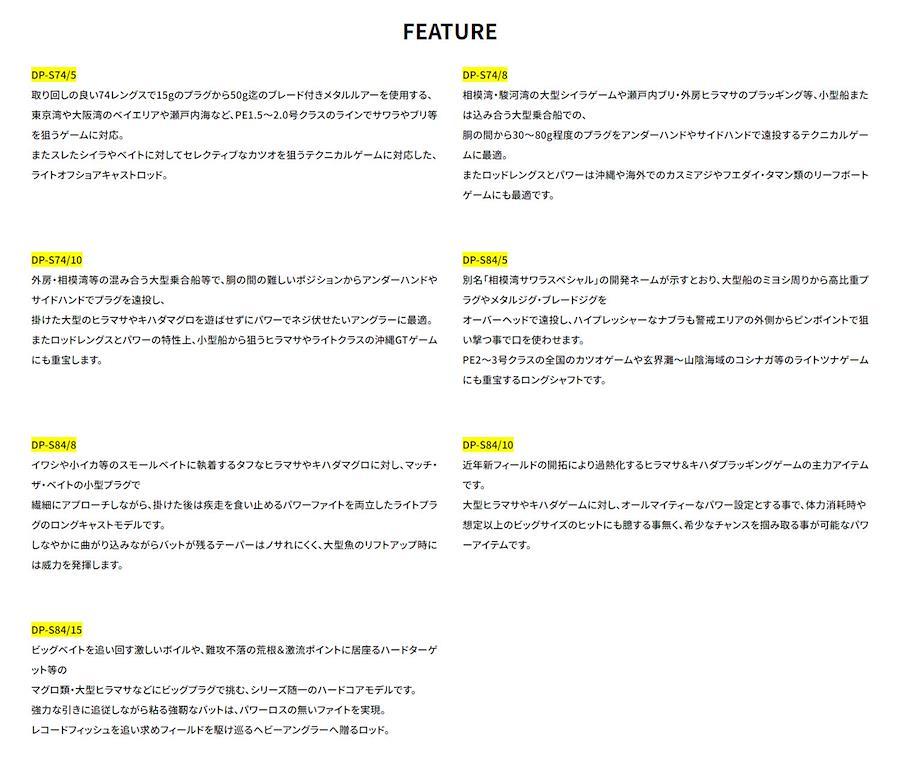 全長: 2.25m (7.4ft) / 継数: 2本 (グリップジョイント) / 仕舞寸法: 約1.69m / 自重: 288g適合ルアーウエイト: ~80g / 適合PEライン: ~5.0号適合ドラグ: MAX 6.0kg / カーボン含有率: 98% (Dual Cross Xラッピング) / スピニングリール対応おすすめ対象魚: サワラ, カツオ , ブリ , シイラ , ブリ , ヒラマサ , マグロなど / おすすめ地域: 全国(特に相模湾・駿河湾・瀬戸内・外房・沖縄・海外など)【DP-S74/8】……相模湾・駿河湾「大型シイラゲーム・瀬戸内ブリ・外房ヒラマサプラッギング等」の小型船や大型乗合船での、胴の間から30~80g程度のプラグをアンダーハンドやサイドハンドで遠投するテクニカルゲームに最適モデル。