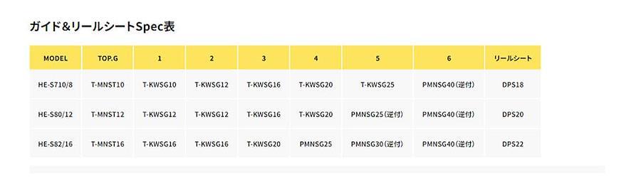 〇【HE-S80/12】……PE5~6号に100~150ポンドクラスのリーダーと60~120gのプラグを使用する、五島~山陰海域や外房海域の大型ヒラマサや、熊野灘~伊豆~相模湾のマグロプラッギング等に対応。どの海域でも活躍する標準的なパワーゲームモデルであり、根ズレが少ない状況であればダイビングペンシルでのGTゲームにも使用可能。