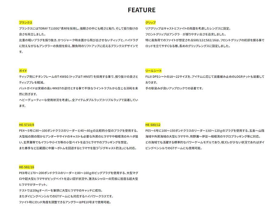 〇【HE-S82/16】……PE8号に170~200ポンドクラスのリーダーと80~160gのビッグプラグを使用する、大型マグロや超大型ヒラマサがビッグベイトを追い回す状況や、激流&シャローの荒根に居座る超大型ヒラマサがターゲット。テストでは20㎏オーバーを筆頭に大型ヒラマサのキャッチに成功。またダイビングペンシルでのGTゲームにも対応するハイパワークラスです。ファイト時にロッド角度を調整できるアングラーはPE10号まで使用可能。