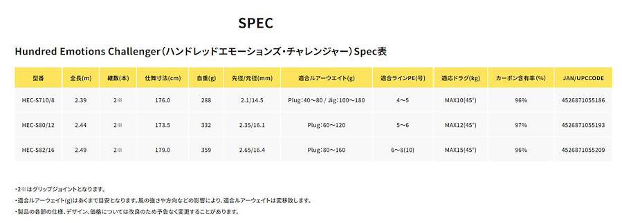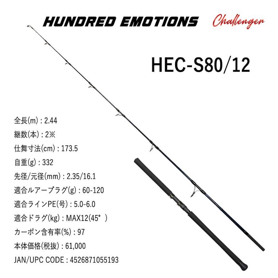 全長:2.44m(8.0フィート) / 継数:2本(グリップジョイントタイプ) / 仕舞寸法: 173.5cm / 自重: 332gスピニングリール対応モデル / 適合ルアープラグ: 60~120g適合PEライン: 5号~6号 / 適合ドラグ: MAX12Kg(45°時)先径: 2.35mm / 元径: 16.1mm / カーボン保有率: 97% (TORAY T1100G採用)品番:【HEC-S80/12】……どの海域でも活躍する標準的なパワーゲームモデルのオフショアキャスティングロッド!! 五島~山陰海域や外房海域の大型ヒラマサや、熊野灘~伊豆~相模湾のマグロプラッギング、ダイビングペンシルでのGTゲーム等にも対応。