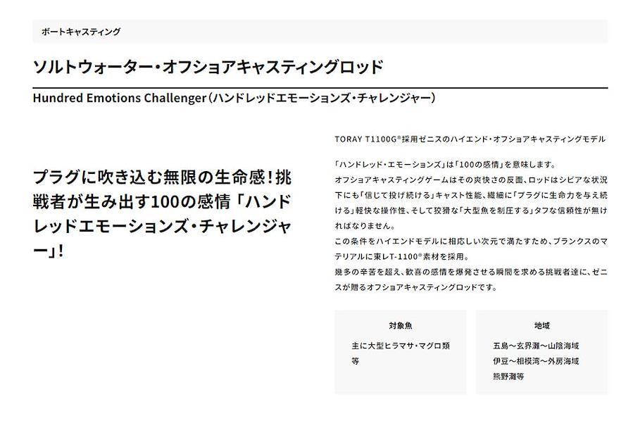 オフショアキャスティングゲームはその爽快さの反面、ロッドはシビアな状況下にも「信じて投げ続ける」キャスト性能、繊細に「プラグに生命力を与え続ける」軽快な操作性、そして狡猾な「大型魚を制圧する」タフな信頼性が無ければなりません。この条件をハイエンドモデルに相応しい次元で満たすため、ブランクスのマテリアルに東レT-1100?素材を採用。幾多の辛苦を超え、歓喜の感情を爆発させる瞬間を求める挑戦者達に、ゼニスが贈るオフショアキャスティングロッドです。