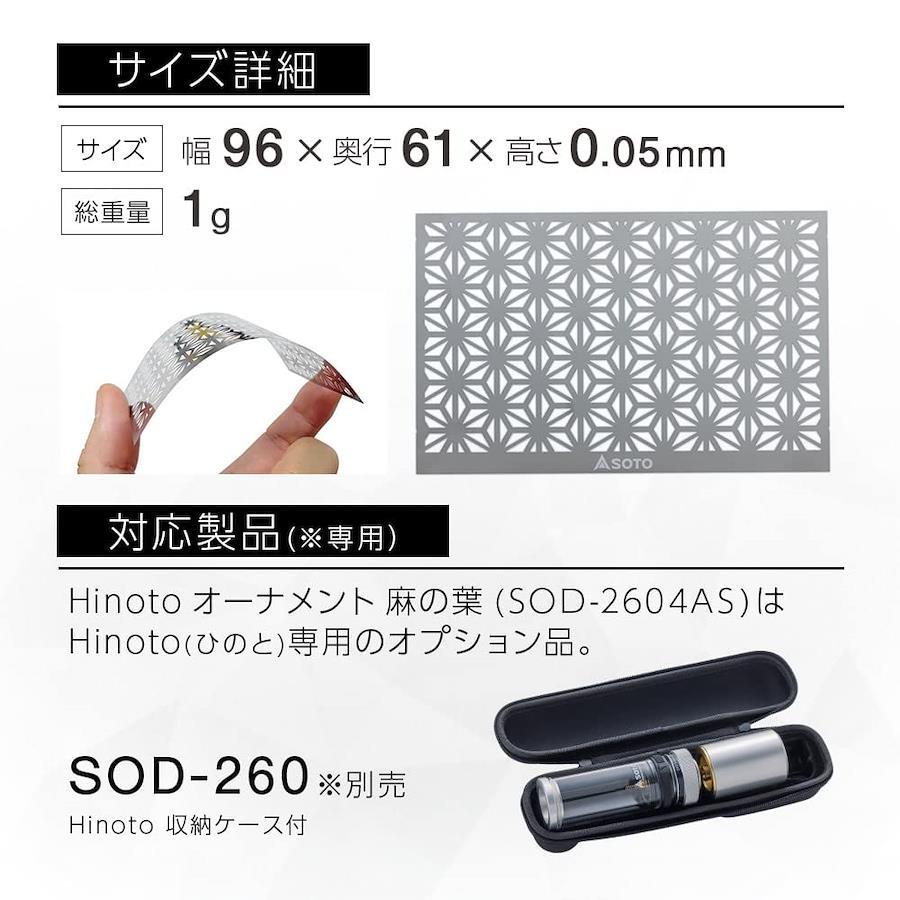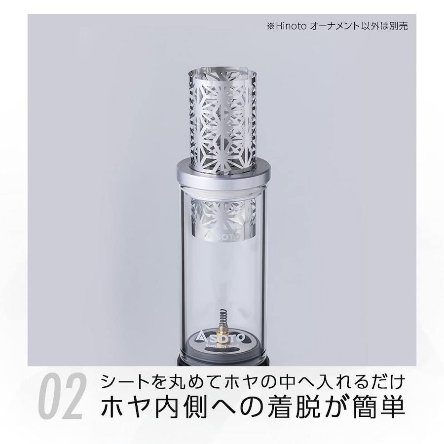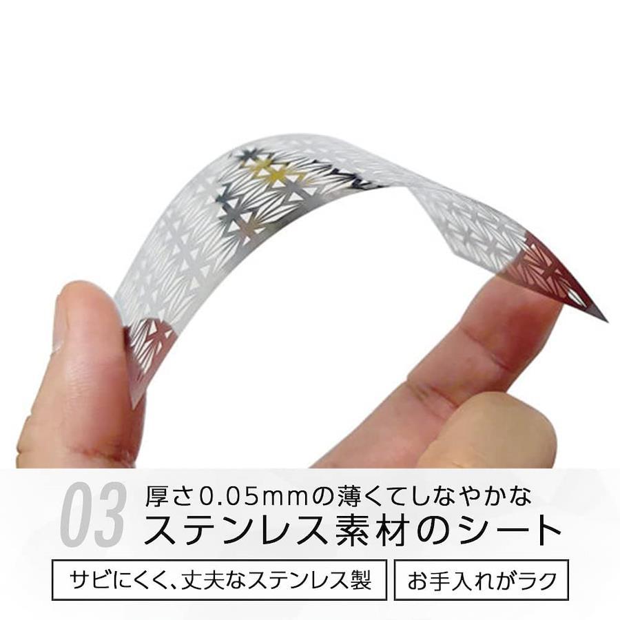 ●特別な時間を演出するキャンドルガスランタンHinoto(ひのと)のゆらめく炎にアクセントを与えるデザインシート。●和柄をモチーフにし、アウトドアでのひとときを煌びやかに演出。●厚さ0.05mmの薄くてしなやかなシートは耐熱性・耐久性に優れたステンレス素材でホヤ内側への着脱が簡単に行える。※商品にHinoto本体は含まれません。本体サイズ:幅9.6cm×高さ6.1cm×厚み0.05mm重量:1g材質:ステンレス原産国:日本