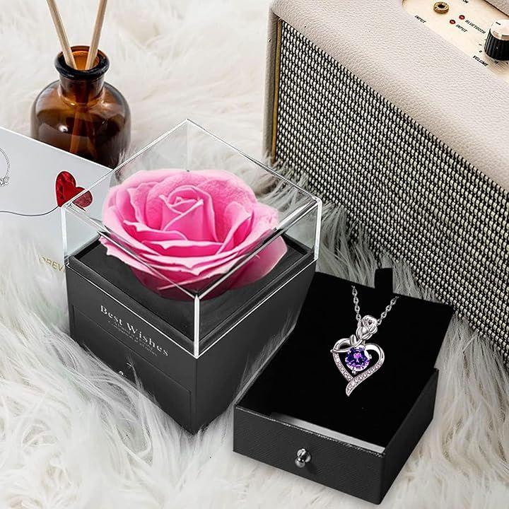 「セット内容」ソープフラワーバラのボックスx1、S925銀ネックレスx1、パッキングx1.大輪の薔薇とレディースネックレスを組み合わせましたローズボックスプレゼントセット。