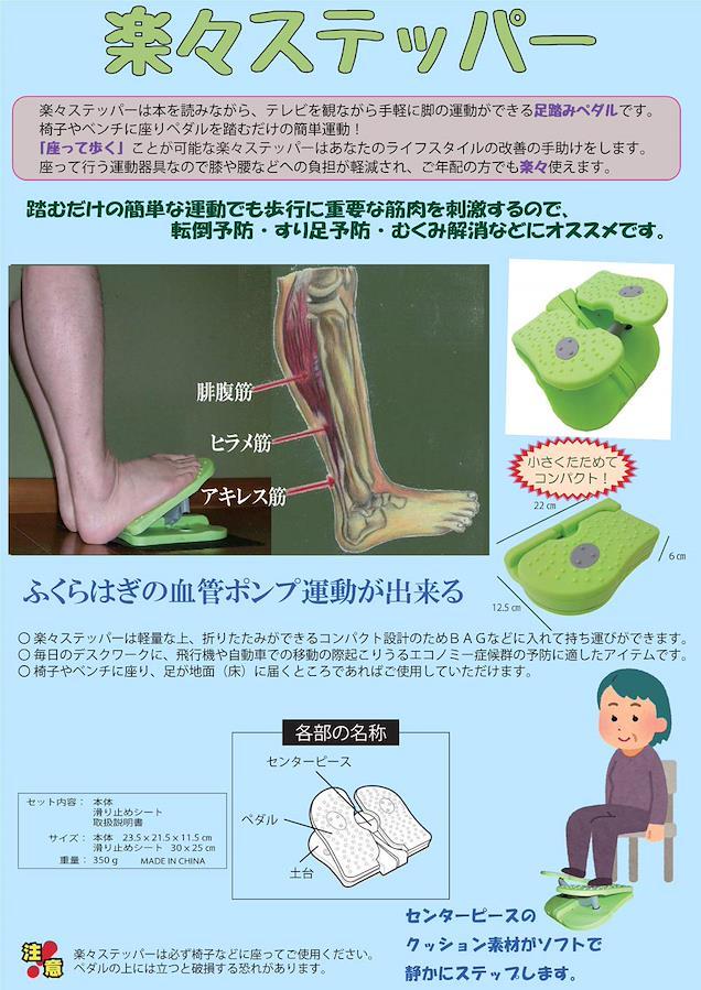 楽々ステッパー楽々ステッパーは本を読みながら、テレビを観ながら手軽に足の運動ができる足踏みペダルです。椅子やベンチに座りペダルを踏みだけの簡単運動!「座って歩く」ことが可能な楽々ステッパーはあなたのライフスタイルの手助けをします。座って行う運動器具なので膝や腰などへの負担が軽減され、ご年配の方でも楽々使えます。踏むだけの簡単な運動でも歩行に重要な筋肉を刺激するので、転倒予防・すり足予防・むくみ解消などにオススメです。ふくらはぎの血管ポンプ運動が出来る。〇楽々ステッパーは軽量な上、折り畳みができるコンパクトな設計のためBAGなどに入れて持ち運びが出来ます。〇毎日のデスクワークに、飛行機や自動車での移動の際起こりうるエコノミー症候群の予防に適したアイテ