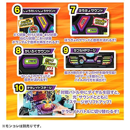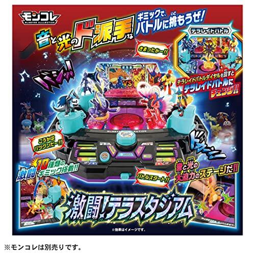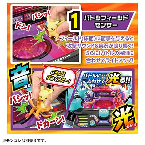 音と光のド派手なギミックで、モンコレバトルに挑もうぜ!10種類の激闘ギミックと2つのバトルモードで、モンコレバトルをド派手に楽しもう!◆10種類の激闘ギミック搭載!(1)バトルフィールドセンサーキミのバトルに合わせて、『ドカッ!』『バシッ!』迫力のバトルサウンドが鳴るぞ!フィールド(床面)に衝撃を与えると攻撃サウンド&実況が鳴り響く!さらに!バトルの展開に合わせてスタジアムの床もライトアップ!バトルシーンに合わせて『きゅうしょにあたったー!』『こうかはばつぐんだ!』実況も流れる!自分だけのオリジナルバトルを繰り広げられるぞ!(2)ダイビングギミックパーツ上部からモンコレを落として攻撃を繰り出せるぞ!(3)アクロバットギミックすくいあげてのアクロバットアタック!(4)ダッシュギミックモンコレを直線的に相手に当てるワザが繰り出せるぞ!(5)じょうたいいじょうサウンド『ねむり状態になってしまったーっ!』どく状態・やけど状態・まひ状態・ねむり状態・こおり状態がランダムで音声が再生されるぞ!(6)テラスタルサウンドボタン『おーっと!ここで