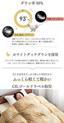 【サイズ】190x210cm(ダブルロング) 【充填量】1.4kg 【重量】約2.37kg 【ループ数】8ヶ所 【素材】側地:綿15%、ポリエステル85% / 詰め物:ホワイトダックダウン (ダウン93%、フェザー7%) 【梱包サイズ】22x22x53cm※ 圧縮袋の色はご購入された商品のカラーに関わらず全てブルーになります。 【生産国】日本(※羽毛の産地は東アジア(台湾・中国等)です。)【カラー】ベージュ◆新基準CILゴールドラベル獲得 -5つ星☆☆☆☆☆- ◆ CILゴールドラベルは、日本で唯一の羽毛専門の公的検査研究機関である、快適睡眠環境研究所(CIL)が発行する品質ラベルで、かさ高165mm以上、ダウンパワー400dp以上の羽毛を使用した高品質な羽毛布団の証です。◆羽毛のにおいについて◆ 羽毛は天然素材のため、無臭ではございません。原毛は洗浄によりほとんど臭いを感じないようにはしておりますが、開梱直後や温度・湿度等の環境等により臭いを感じる場合がございますので、開封直後には風通しの良い場所での十分な陰干し等をお勧めいたします。なお、天然羽毛の臭いのため人体に害はございませんのでご安心ください。◆安心の7年保証◆ 正常な使用状況において、製造上の責任による損傷が発生した場合、購入から7年以内で修理・交換を致します。(当店で管理するお客様情報から照会させて頂きます。受注確認メールの保管をお願い致します。) ≪保証内容について≫ 1.製造上の責任による損傷が発生した場合 2.羽毛の吹き出し(但し、側地より、大きな羽毛が使用に耐えないほど大量に飛び出した場合に限ります。) 3.下記の場合は有効期間中であっても無償保証はできませんのでご注意ください。( A.誤った取り扱いによる損傷 B.不当な処理や改造をされた場合の損傷 C.火災等の天変地異による損傷 D.転居等の輸送で生じた損傷 E.保証書の紛失及び提示の無い場合 )※遠隔地からの修理につきましては、往復の送料を頂きます。◆おすすめポイント◆ ◎5つ星 CILゴールドラベル取得(かさ高165mm以上、ダウンパワー400dp以上)◎フィット感アップ30マス立体キルト ◎7年保証 ◎ホワイトダックダウン93% ◎丁寧に仕上げた日本製 ◎羽毛をふっくら復元!国内パワーアップ加工!◎肌触りなめらかなピーチスキン加工 ◎羽毛の飛び出しを防止するダウンプルーフ加工 ◎暖かさを逃がさない立体キルト