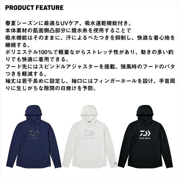 太陽光から肌を守り、心地よいドライ感が続く。春夏シーズンに最適なUVケア、吸水速乾機能付き。本体素材の肌面側凸部分に撥水糸を使用することで吸水機能はそのままに、汗によるべたつきを抑制し、快適な着心地を継続する。ポリエステル100%で軽量ながらストレッチ性があり、動きの多い釣りでも快適に着用できる。フード先にはスピンドルアジャスターを搭載。強風時のフードのバタつきを軽減する。袖丈は若干長めに設定し、袖口にはフィンガーホールを設け、手首周りに生じがちな隙間の日焼けを予防。 サイズ:2XL カラー:グレープネイビー ※実物と色が違って見える場合があります。あらかじめご了承下さい。