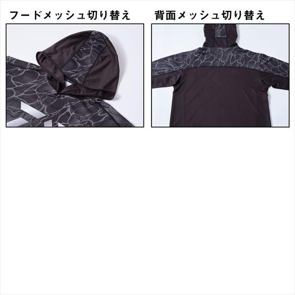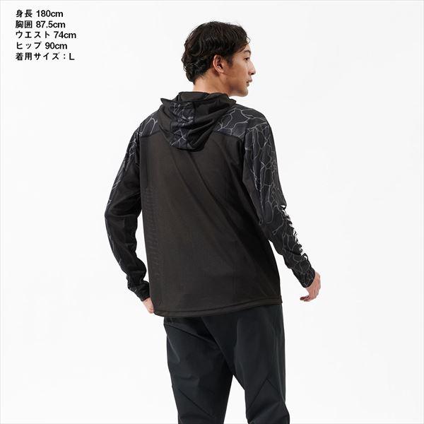 通気性に特化した真夏の定番シャツ。猛暑や湿気などが身体へのダメージを極力低減させるために、前身頃と袖部には、ストレッチ性・UVケア・吸水速乾性のある生地を採用。フード首部、後身頃、脇下は、風通しの良いメッシュで切り替えている。 サイズ:XL カラー:タイドブラック ※実物と色が違って見える場合があります。あらかじめご了承下さい。
