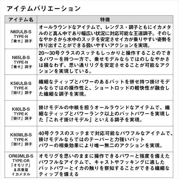高い実釣性能を誇るイカメタル・オモリグのベーシックモデル。現代イカメタル・オモリグシーンに必要とされる性能やテクノロジーを詰め込んだべーシックモデル・エメラルダスMX。■N65LB-GS・W TYPE-N(「乗せ」調子)・・・イカメタルロッドのスタンダードであるレギュラーテーパーの「乗せ」モデル。N65LB-GSはティップ部にグラスソリッドを採用することで優れた目感度を発揮し、正確にアタリを捉えることを狙ったセッティングである。レングス・調子ともにイカメタルのど真ん中であり、幅広い状況に対応可能な王道調子。そのしなやかさから水中のリグを安定させ、イカが乗りやすい姿勢を作り出すことができる扱いやすいアクションを実現した一本である。 全長:1.96m 重量(g):81 継数:2 仕舞寸法(cm):103 スッテサイズ:30-115g/8-30号 適合ライン(PE):0.4-1.0号 先径/元径(mm):0.7/8.9 カーボン含有率(%):86 ※実物と色が違って見える場合があります。あらかじめご了承下さい。