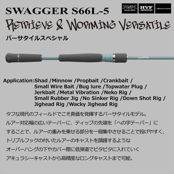 S66L-5は、タフな現代のフィールドでこそ真価を発揮するバーサタイルモデル。ルアー対応幅の広いテーパーに、ティップの先端を「への字テーパー」にすることで、ルアーの重みを乗せる部分を一極集中させることで投げやすく、トリプルフックの付いたルアーのキャストを躊躇するようなオーバーハングの下やカバー際に低弾道でピタピタに入れていくアキュラシーキャストから高精度なロングキャストまで可能。ソフトなティップの先端を「への字テーパー」にすることで、ワーミングに於いては、スタックを躱しつつ自動的にラインスラックを作りだし、ボトムの小さな起伏を鋭敏に感じとれる感度と繊細さがある。バスだけに留まらず、あらゆるフィッシュイーターにも対応するマルチパーパスロッド。 全長:1.98m ジョイント仕様:並継 重量(g):95 継数:5 仕舞寸法(cm):48 ルアーウェイト(g):0.9-14 ルアー重量(oz):1/32~1/2 適合ライン(ナイロン):2.5-8lb 適合ライン(PE):MAX1.2号 先径/元径(mm):1.6/10.3 テーパー:F カーボン含有率(%):99 ※実物と色が違って見える場合があります。あらかじめご了承下さい。