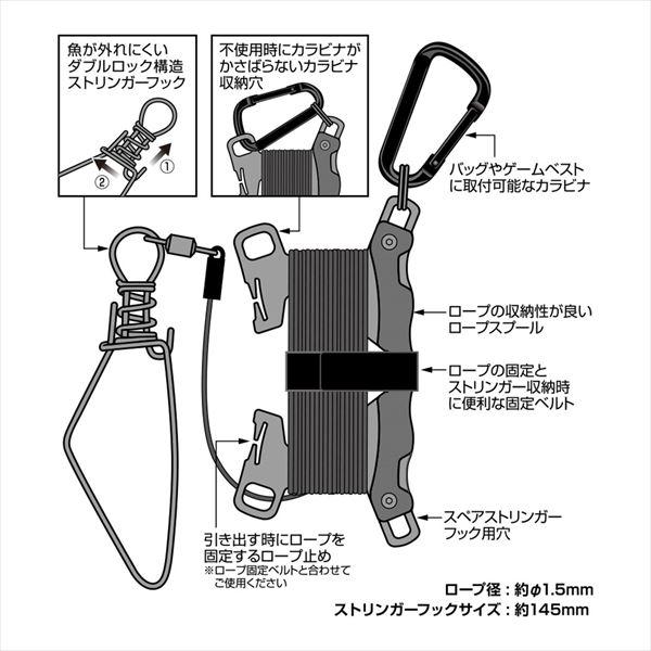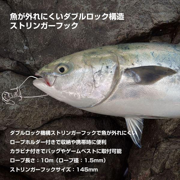 魚が外れにくいダブルロック構造ストリンガーフック。ダブルロック機構ストリンガーフックで魚が外れにくい。ロープホルダー付きで収納や携帯時に便利。カラビナ付きでバッグやゲームベストに取付可能。ロープ長さ:10m(ロープ径:1.5mm)。ストリンガーフックサイズ145mm サイズ:フックサイズ145mm ロープ長さ:10m ※実物と色が違って見える場合があります。あらかじめご了承下さい。