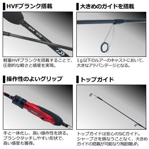 全長:2.03m 継数:2 仕舞寸法:105cm 自重:63g 先径/元径:10.7mm/9.9mm ルアー重量:0.5-8g 適合ライン ナイロン:1.5-4lb 適合ライン PE:0.1-0.4号 カーボン含有率:96% ワンランク上の軽さと操作性を兼ね添えたハイコストパフォーマンスのアジング入門ロッド。ロッドワークで誘い、フォール・ステイ中のバイトを掛けるアジングの醍醐味を堪能できる高品質なブランクと、アングラーのレスポンスを加速させる握りやすいコンパクトグリップを採用するアジングロッド。エントリークラスながら、50?台~いう超軽量・高感度設計。さらに、ラインの放出性がよいダイワ独自のガイドセッティングによって、軽いルアーの優れた遠投性を実現。また、夜間でもラインを通しやすい。 ■68L-S・・・漁港でのアジングにおいて最もスタンダードとなるはじめの1本。ジグヘッドリグを中心にスプリットショットやメタルジグなどの幅広いルアーに対応する。足場の高い堤防などでも操作が行いやすい。(2020年発売モデル)※掲載している商品の画像は代表画像を表示しています。また実物と色が違って見える場合があります。あらかじめご了承下さい。