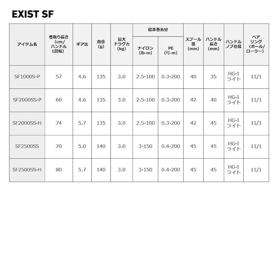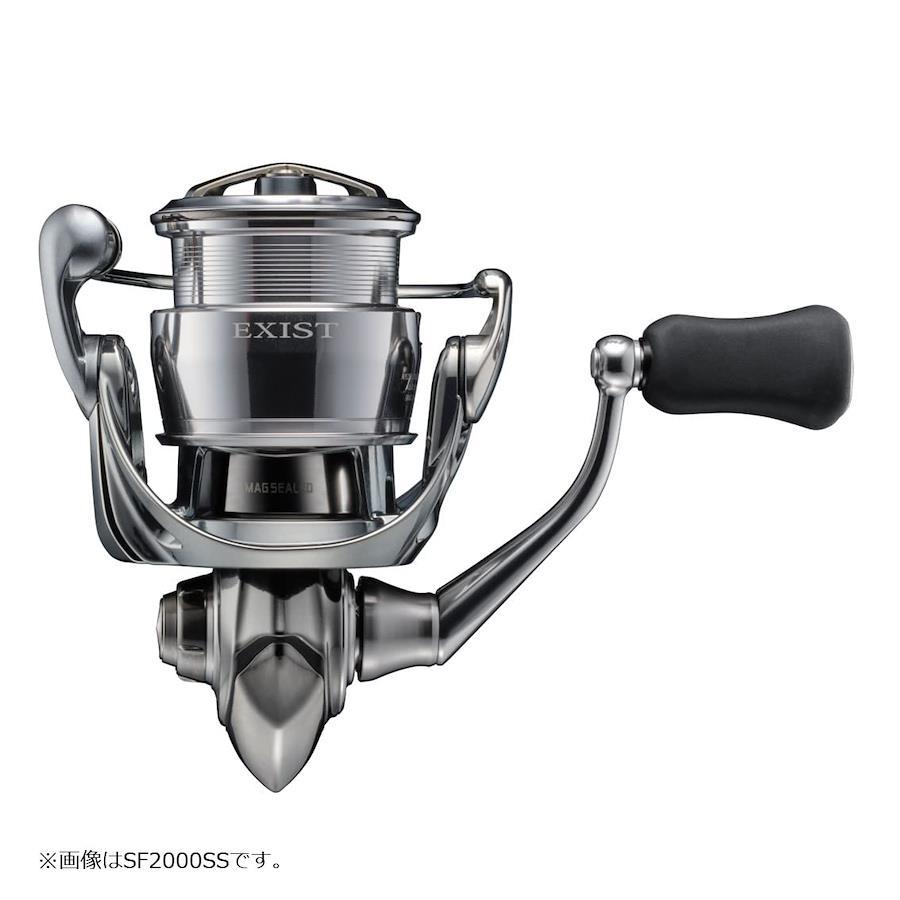 EXIST SF!!フィネスを超える未体験ゾーンへ。覚醒する操縦性。SF(スーパーフィネス)コンセプト――これまでのフィネスを、はるかに超えた領域で、ミリ単位の精緻なコントロールを可能にするスピニングリールの設計思想。この新たなチャレンジに、われわれダイワは、小型スピニングリールのフラッグシップ「EXIST」を選んだ。それは、なぜか。ダイワは、フラッグシップに平穏を求めない。なれ合いはしない。常にフィッシングシーンのフロントランナーであってほしいと願っている。EXIST SF――誤解を恐れずにいうなら、優等生ではない。EXISTのフィロソフィーを継承しつつも、そこに常識はない。バーサタイルではなく一点突破。目指したのは、フィネスを超えるスーパーフィネス。エアドライブデザイン、フルメタル(Mg製)モノコックボディ、マグシールドといったEXISTの基本性能は維持したまま、ギリギリまで追い込んでチューニングしている。ターゲットを、4lb(フロロ・ナイロン)もしくは0.6号(PE)以下のラインを用いたバス、トラウト、ライトソルトに絞り込み、徹底的にコンパクト化・軽量化。そのために一定レベルの耐久性・防水性は削ぎ落としたが、それらによって得られる対価は、いまだだれも踏み入れたことのない領域。これまでのフィネスの限界域をはるかに超えたその先で、心に描いたイメージどおりにルアーが軌道を描く“操縦性”は、魚との一対一の濃密な時間をもたらせてくれるだろう。ギリギリまで絞り込んだ自重は、過剰な力を加えなくても振り抜けるキャスティング性能となって、飛距離と精度に貢献する。手のひらに包み込めるようなコンパクトなボディは、繊細なタッチでのフェザリングを可能にし、狙い通りのアプローチを約束してくれるだろう。ショートスプールはATD TYPE-Lによるラインのスムーズな滑り出しを、より高度な次元まで昇華させた。テクノロジーのすべてをスーパーフィネスへ。アングラーを覚醒させる、EXIST SF、デビュー。EXIST SF・EXIST LTの違い■20%ドラグ性能UP ⇒スプールのショート化によりライン放出時にかかる抵抗のバラツキを抑制。 更に最大ドラグ力を3kgに変更する事で、フィネスの釣りにおいて重要視される低ドラグ域での調整幅が広がり、より最適なドラグの微調整が可能。■飛距離/スイングスピード 約7%/約12%UP ⇒EXIST SF2500SSとSTEEZ RC61L-SVとの超軽量タックルの組み合わせにより、既存タックルに比べスイングスピードが約12%UP。 それにより軽量ルアーのロングキャスト性能が向上。同じ距離へのキャストにおいては、より力を抜いてキャストする事が出来る為、キャスト精度も向上。■大幅な軽量化 ⇒ボディを約20%コンパクト化することにより大幅な軽量化を実現(LT2500S=160gに対し、SF2500SS=140g)。■約16%感度UP ⇒メインシャフトの小径化等、内部部品をSF専用設計することにより、振動伝達性能が向上。