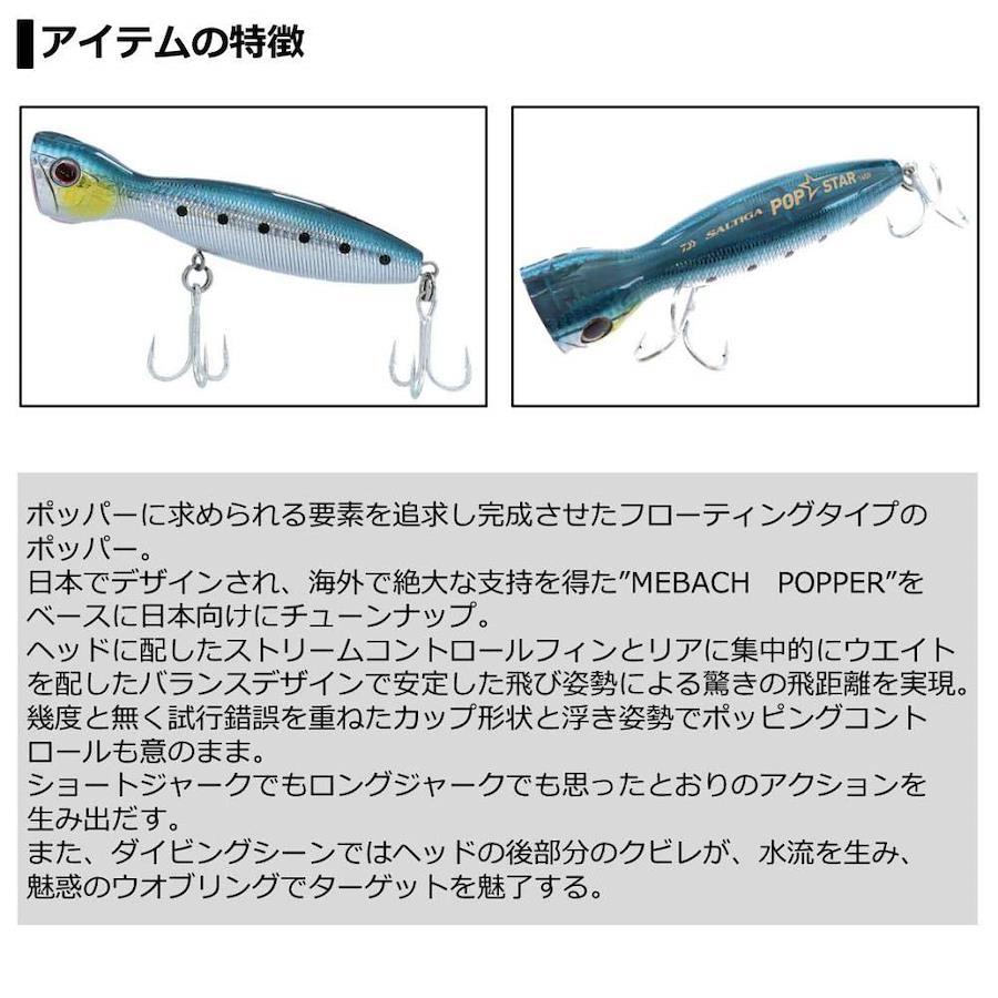 ソルティガスタープラグ計画第一弾!ポッピングコントロール性能をとことん追求した実戦向けポッパー。ポッパーに求められる要素を追求し完成させたフローティングタイプのポッパー。日本でデザインされ、海外で絶大な支持を得た「MEBACHI POPPER」をベースに日本向けにチューンナップ。 ヘッドに配したストリームコントロールフィンとリアに集中的にウエイトを配したバランスデザインで安定した飛び姿勢による驚きの飛距離を実現。 幾度と無く試行錯誤を重ねたカップ形状と浮き姿勢でポッピングコントロールも意のまま。 ショートジャークでもロングジャークでも思ったとおりのアクションを生み出します。 また、ダイビングシーンではヘッドの後部分のクビレが、水流を生み、魅惑のウオブリングでターゲットを魅了します。 ホログラムはカラーバランスを考慮し、厳選されたホロパターンをチョイス。 フックは錆に強いTINメッキ仕様ヘビーシャンクワイヤーを採用。不意の大物にも十分な強度を発揮。 フロントフックアイは、スイベル仕様で船べりでの攻防戦においてのアドバンテージを約束します。