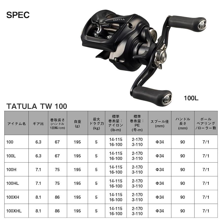 「TATULAブランド10周年!」 次の10年を見据えた第3世代TATULAデビュー!【ギア比】:7.1【巻取り長さ(cm/ハンドル1回転)】:75【自重(g)】: 195【最大ドラグ力 (kg)】:5【標準糸巻量ナイロン(lb-m)】:14-115, 16-100【標準糸巻量PE(号-m)】:2-170, 3-110【ハンドル長(mm)】:90【スプール径(mm)】: Φ34