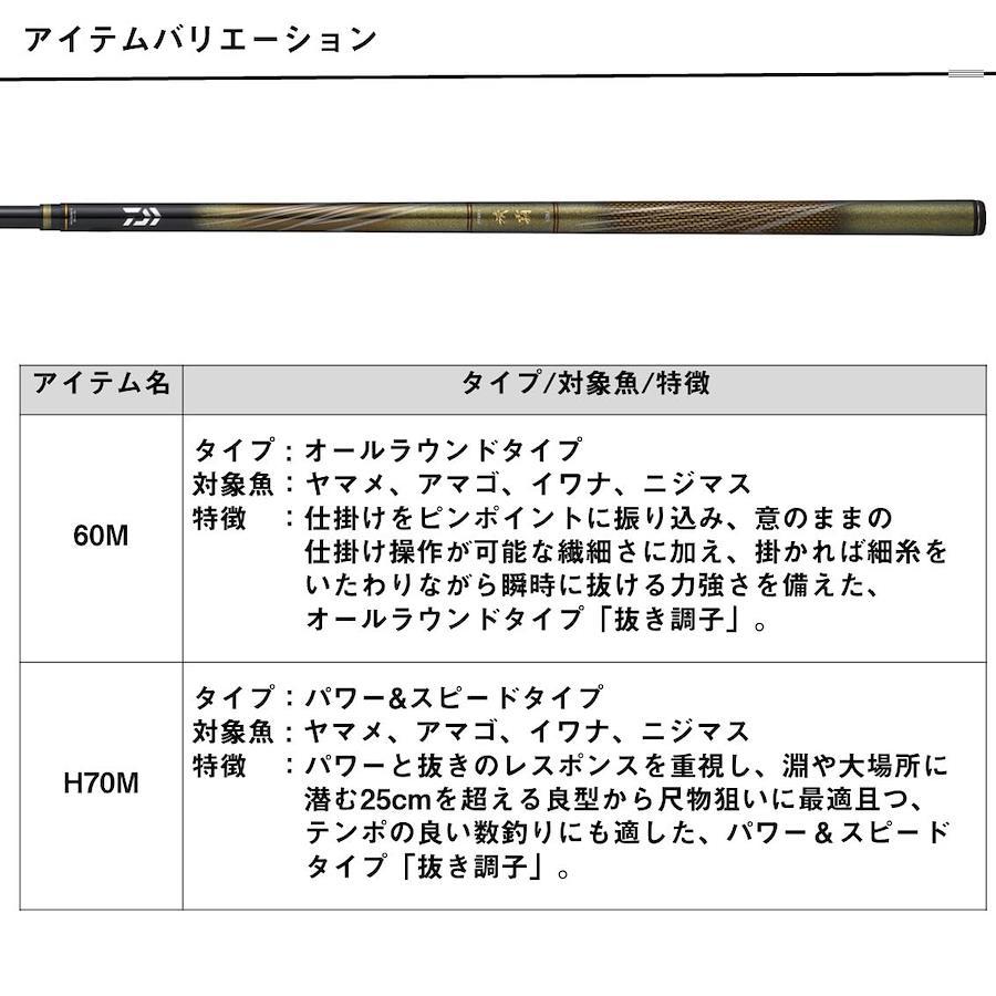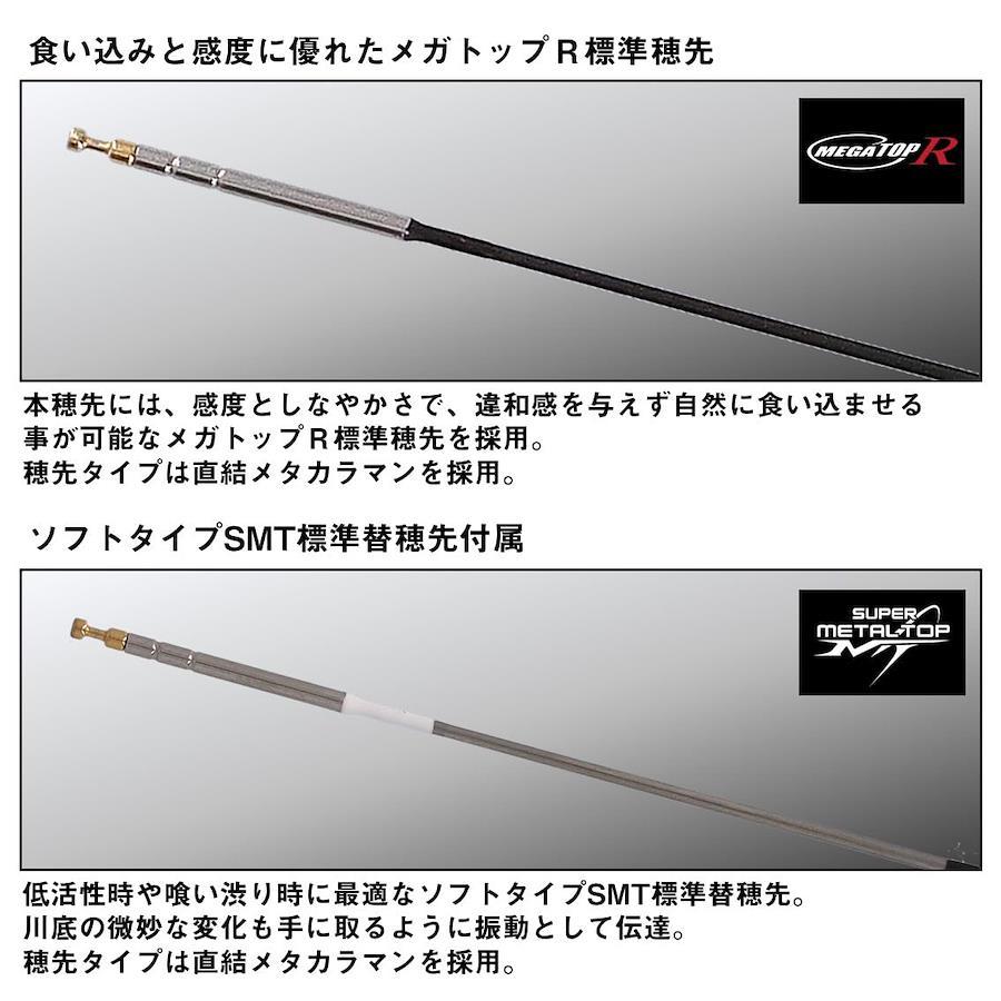 通常1-5営業日で発送【新品未開封品】最新のロッドテクノロジーによって、更なる進化を 遂げた「流覇」。 抜調子ながら、従来のチューブラー穂先から新たに 「メガトップR」を採用し、感度と操作性の絶妙な バランスを実現。ソフトタイプの「SMT」標準替穂先に 替えれば、低活性時や喰い渋り時にも適応し、川底の微妙な変化も手に取るように振動として伝達。 更に60cmの伸縮マルチにより、川幅等の環境変化にも対応。また、「V-ジョイントα」の採用により、狙ったところで瞬時に抜ける高いタメ性能と リフト力を獲得しただけでなく、細糸での意のままの仕掛け操作やドリフトコントロールを実現。 まさに、流れを制覇する「抜調子」。