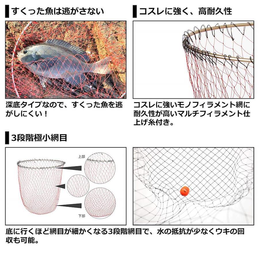 魚をすくったら逃げにくい深底仕様。底に行くほど網目が細かくなる3段網目で、水の抵抗が少ない。ウキの回収も可能。コスレに強いモノフィラメント網に耐久性が高いマルチフィラメント仕付け糸付き。※枠は別売です。