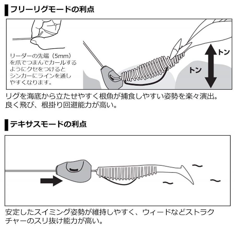 二刀流バレットシンカー。1つで2役! 2つのモードを搭載した新形状中通式バレットシンカー。カラーは水色に溶け込みやすいマッドカーキカラー。ラインを抜く方向を状況により選択することが可能な2WAY機能搭載。ボトムパンピングを多用するフリーリグモードとスイミングで喰わせるテキサスモードを1つのシンカーで演出できる。