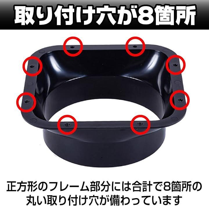 「商品内容 」方型ダクトコネクター(正方形のフレーム部分と丸い取り付け穴が備わっています)は配管と配管をつなぎ合わせるための接合部に使うパーツです。