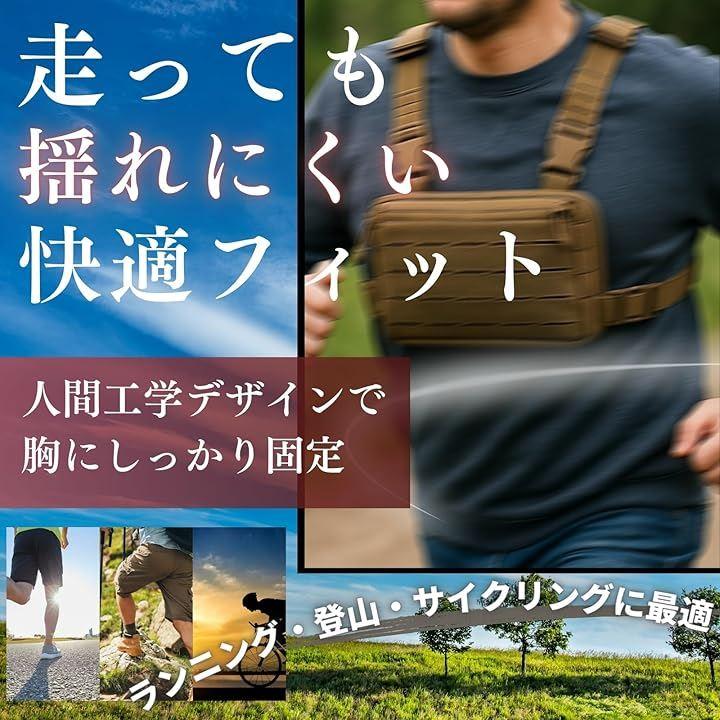 「ランニングでも揺れにくい安定設計」 人間工学に基づいたチェストリグ形状で、胸元にしっかりフィットして揺れを抑える安定感を実現。