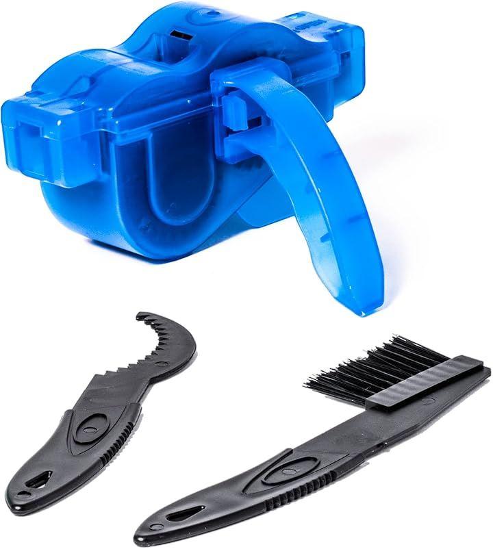 クリーニング用のブラシを内蔵したクリーニング容器、スプロケットの間に挟まった汚れを書き出すスクレーパー、プーリーやチェーンリングの汚れを落とすブラシの3点セットです。
