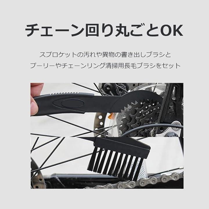 「ドライブトレインまとめて清掃」スプロケットの間の油汚れや異物を除去するギザギザのついたスクレーパーと、プーリーやチェーンリングなど幅広く使用できる長毛のブラシをセットしています。