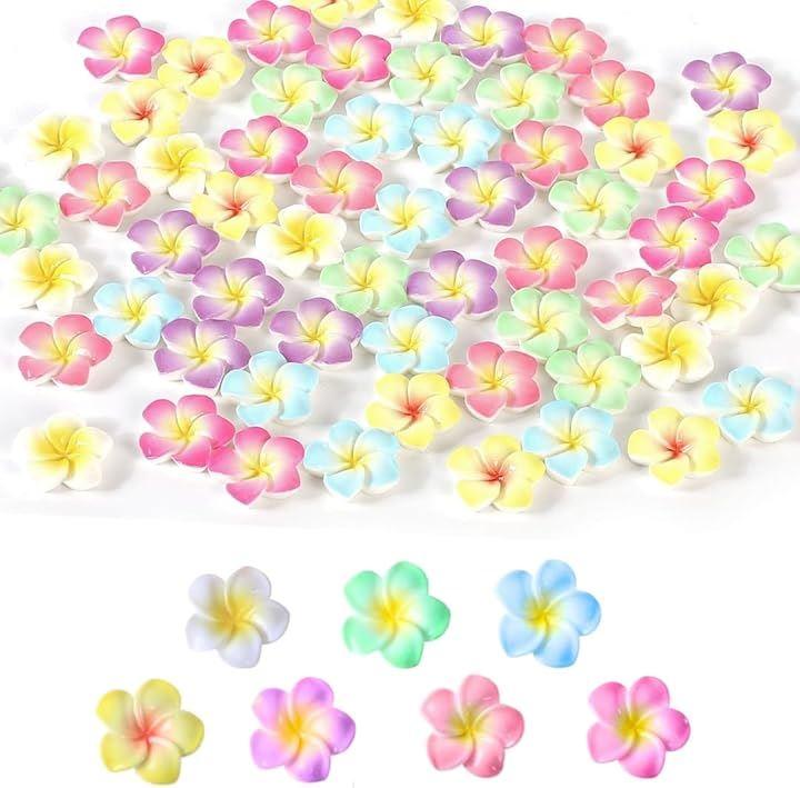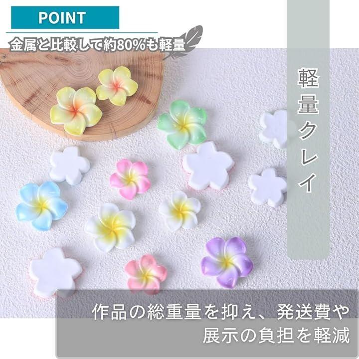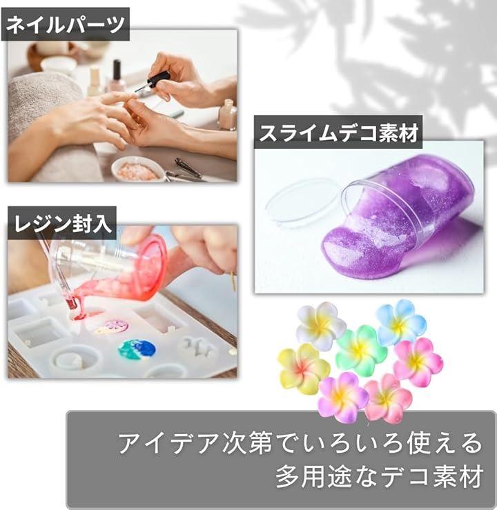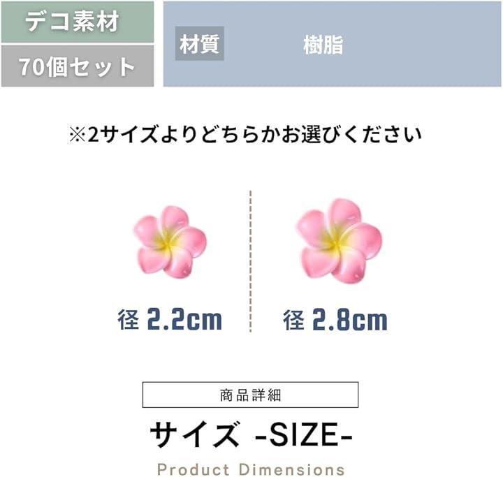 「商品内容」パッケージ内容:アクセサリーパーツ(プルメリア)7色70個セット、サイズ(約):直径2.2cm/2.8cm 厚さ0.5cm、素材:樹脂 *サイズ詳細は商品画像をご確認ください。