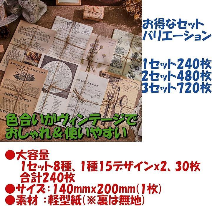 「商品内容」1セット8種 1種15デザインx2枚 合計240枚「サイズ」140mmx200mm 「バリエーション」1セット240枚、2セット480枚、3セット720枚「素材」軽型紙(裏は無地)
