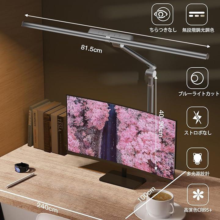 セード幅800mm・アーム長600mm+300mmのデスクライト、中心直下照度1800 Lxで机の隅々まで明るく照らします。