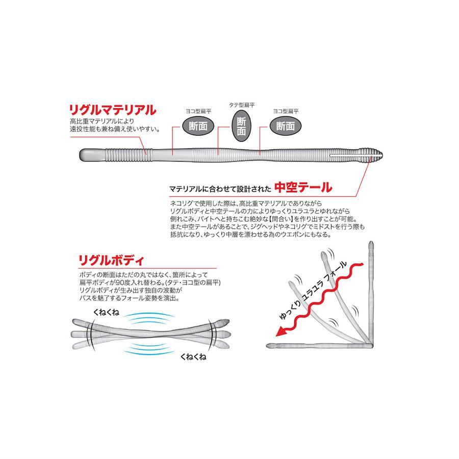 生命波動を生み出す 新基準ストレートワーム!「くねくねする」という意味を持つリグルクローラーのボディは、扁平ボディがタテ・ヨコに90度入れかわる特殊形状を採用。通常の丸い断面よりもアクション時の水の受け方が多彩で、より「くねくね」と生命感溢れる動きと波動を生み出します。高比重マテリアル&中空テールを備え、コストパフォーマンスにも優れた新基準ストレートワームの登場です。