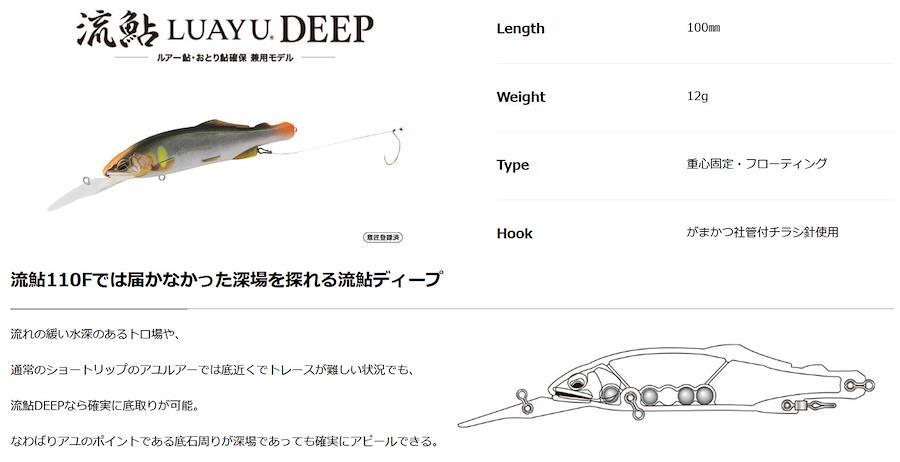 流鮎110Fでは届かなかった深場を探れる流鮎ディープ。流れの緩い水深のあるトロ場や、通常のショートリップのアユルアーでは底近くでトレースが難しい状況でも、流鮎DEEPなら確実に底取りが可能。なわばりアユのポイントである底石周りが深場であっても確実にアピールできる。