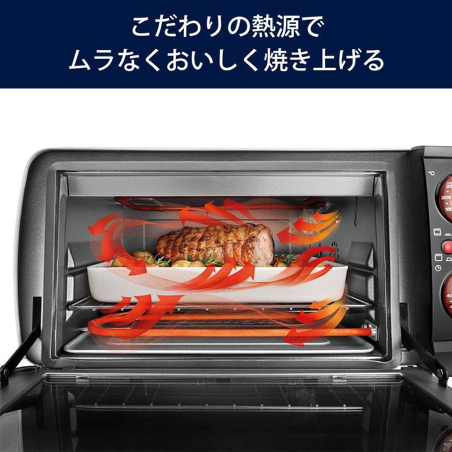 サラウンドコンベクションシステム採用の8.5Lのコンパクトサイズのミニコンベクションオーブン。●コンベクション機能を最大限引き出すために、ファンとファンカバーを新開発安全性だけでなく、熱を逃がさない二重構造の三位一体のサラウンドコンベクションシステム。熱風が庫内の隅々まで行き渡り、ムラなくおいしく焼きあがる。失敗知らずの新しいコンベクションオーブンができました。●こだわりの熱源でムラなくおいしく焼きあがるM字型シーズヒーターを採用し、庫内に熱をまんべんなく行き渡らせることができます。●二重構造で表面温度の低減を実現し安全性を向上本体、ドアともに二重構造に。オーブン表面の温度が抑えられるだけでなく、より設定した温度保つ構造を実現。●トーストは4枚まで焼け、コンパクトながら庫内ひろびろコンパクトながらトーストは4枚を一度に焼くことができ、朝から活躍します。上下ヒーター間は11.5cmと高さのある耐熱容器も入ります。●シンプルで簡単な操作温度と時間、機能を決めればあとはオーブンにおまかせ。複雑な設定いらずの、誰でも使えるダイヤル式です。「もう少し焼き目を付けたい」など、食材の調理具合によって時間・温度・機能の変更も調理途中でも簡単にできます。●赤いつまみのシンボリックなデザイン赤いつまみはデロンギ・オーブン開発当時からのデザインを踏襲。キッチンを一層スタイリッシュに彩ります。●パリッと焼きあがるピザストーン角型ピザストーンが付属。食材から出る水分や油分を程よく吸収し、パリッと焼き上げます。●オリジナルレシピブック付属料理家 渡辺麻紀先生オリジナルのレシピブックが付属。●二重成形非塩ビプラグ採用●欧州RoHs指令適合●再資源化システム付き