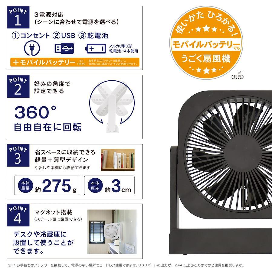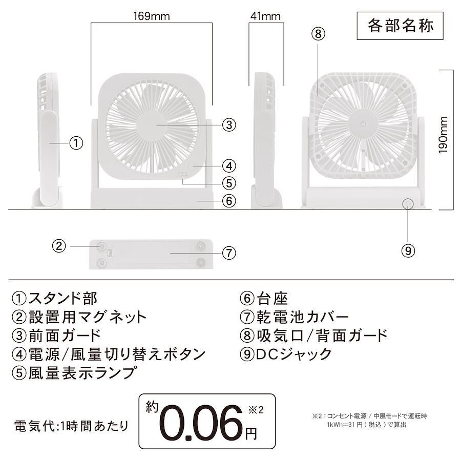 【商品仕様】◇本体サイズ:幅16.9×奥行4.1×高さ19cm◇本体重量:275g◇電源:コンセント、USB、乾電池(アルカリ単3形乾電池×4本使用)◇消費電力:約3.5W(最大)※ACアダプタ使用時◇風量調節:3段階◇角度調節:上下360°(手動)◇切タイマー:約10時間で自動オフ◇コードレス稼動時の持続時間:弱/16時間、中/6.5時間、強/3時間◇付属品:専用ACアダプター、USB電源ケーブル(コード長:約1.3m)、取扱説明書(保証書)◇保証期間:お買い上げ日より1年間(保証の範囲については、取扱説明書をご確認