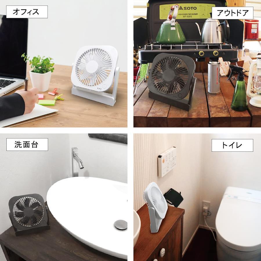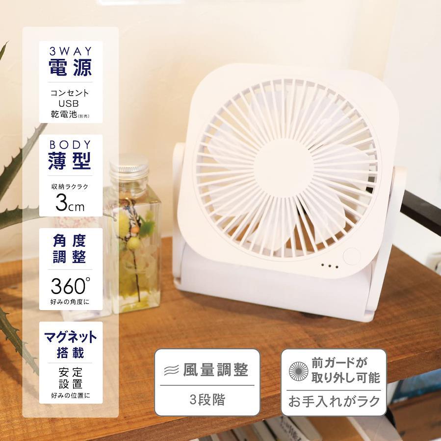 3営業日以内に発送≪新品未開封品≫:洗面所・トイレ・オフィスで活躍する卓上扇風機になります。アウトドアでもお使いいただけます。●マグネット付きでデスクや冷蔵庫に設置できます。●コンパクトデザインで収納にも便利です。●360度お好みの角度で、手動にて自由自在に調節可能です。●切タイマー機能があり、約10時間で自動オフします。●風量調節は3段階(弱/中/強)設定可能です。●3WAY電源で、コンセント/USB/乾電池の3パターンで使用可能です。モバイルバッテリーに対応可能です。