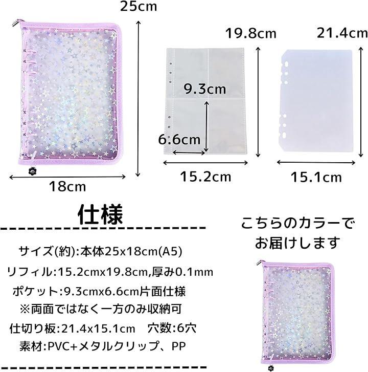 「商品スペック」サイズ:18cmx25cm(A5)、重量:350g、素材:半透明クリアファイル、6穴仕様、リフィル交換可能。