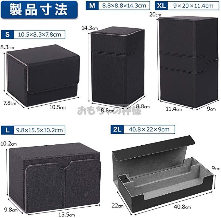 「サイズ」Sサイズ(10.5x8.3x7.8cm)Mサイズ(8.8x8.8x14.3cm)、Lサイズ(9.8x15.5x10.2cm)、XLサイズ(9x20x11.4cm)、2L(40.8x20x9cm)「収納数」Sサイズ(約120枚)Mサイズ(約120枚)、Lサイズ(約240枚+ダイス入れ)、XLサイズ(約240枚+ダイス入れ)*レギュラーサイズのカードをスリーブに入れた状態です。